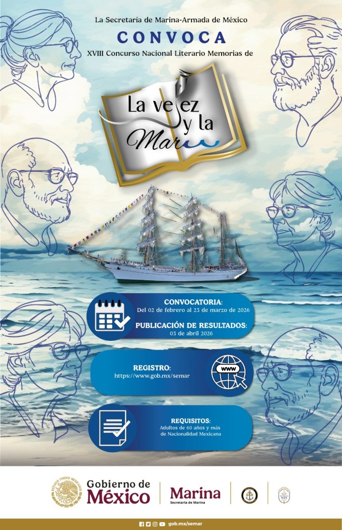 Ciudad de México.- La Secretaria de Marina-Armada de México con el fin de fomentar y participar en actividades socioculturales y cívicas en aspectos relacionados con el medio ambiente marítimo; así como llevar a cabo acciones en beneficio de la seguridad y bienestar de los diferentes sectores de la población mexicana, invita a las personas con 60 años de edad o más de nuestro país, a participar en el *XVIII Concurso Nacional Literario Memorias de «La Vejez y la Mar» 2026.*