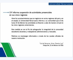«Ante los acontecimientos que se registran en varias regiones del país y en el estado, la Universidad Veracruzana informa a su comunidad que el día lunes 23 de febrero las actividades se llevarán a cabo de manera virtual en las cinco regiones universitarias. Esta medida es con el fin de salvaguardar la integridad de la comunidad estudiantil, docentes y trabajadores administrativos y manuales», advirtió en un comunicado oficial.