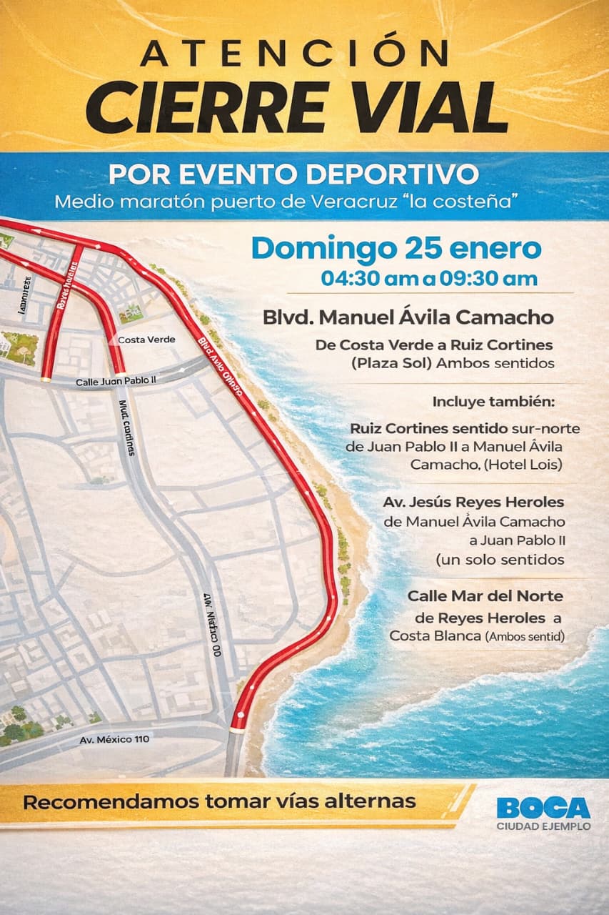 Boca del Río, Ver.– Autoridades municipales informaron sobre un cierre vial temporal que se aplicará este domingo 25 de enero, con motivo del Medio Maratón Puerto de Veracruz “La Costeña”, por lo que se exhorta a la ciudadanía a tomar precauciones y utilizar vías alternas.