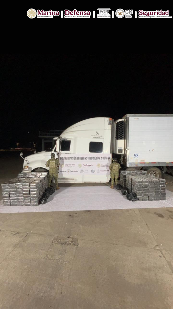 Efectivos de la Unidad Naval de Protección Portuaria de Mazatlán, al inspeccionar un tractocamión con equipo de rayos “X” y con apoyo de tres binomios caninos, detectaron un doble fondo donde se encontraron 494 paquetes y seis bolsas que contenían una sustancia con las características de la metanfetamina, con un peso aproximado de 1.5 toneladas.