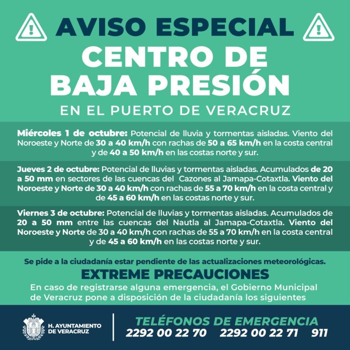 Veracruz, Ver., 1 de octubre de 2025.- El Gobierno Municipal de Veracruz, a través de la Unidad de Protección Civil, informa sobre el Aviso Especial por centro de baja presión en el Golfo de México.