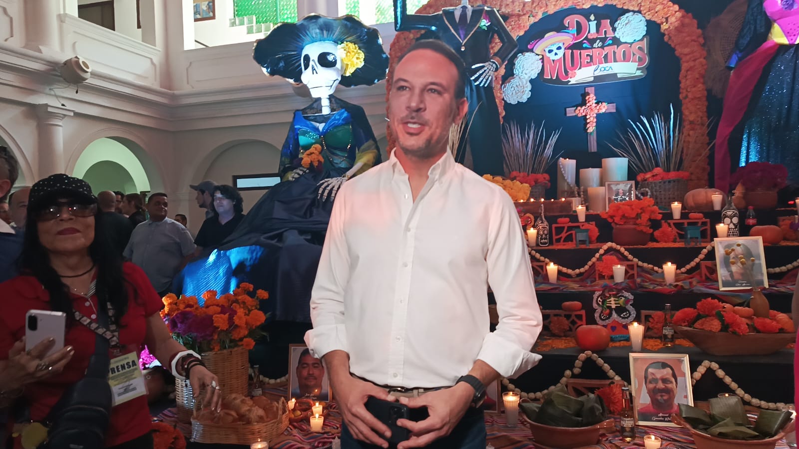 El alcalde Juan Manuel de Unanue Abascal encabezó la ceremonia y destacó la participación del personal del ayuntamiento en la elaboración del altar, el cual fue decorado con elementos tradicionales, flores de cempasúchil, veladoras y fotografías alusivas a la festividad.