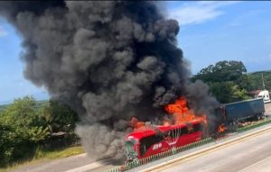 Veracruz, Ver., 10 de septiembre de 2025.- Al menos 14 heridos y una docena de personas con crisis nerviosa, provocó un choque múltiple que terminó en un incendio que consumió dos vehículos, entre ellos a un ADO, y colapsó la vialidad en la autopista La Tinaja.