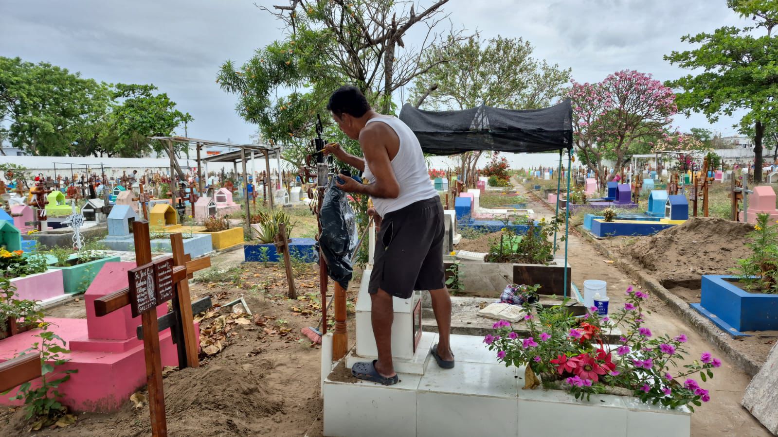Personal de la dirección de Panteones realizó labores de limpieza en las cinco hectáreas del camposanto, retirando cacharros, floreros con agua estancada y desechos sólidos, además de desmalezado para reducir riesgos sanitarios asociados a la acumulación de agua, basura y vegetación nociva.
