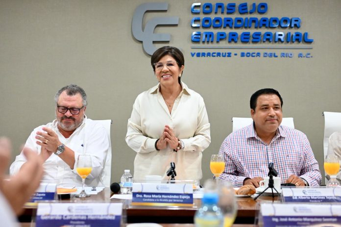 Veracruz, Ver. 29 de abril de 2025.- En el marco de su primer día de campaña a la alcaldía de Veracruz, Rosa María Hernández Espejo, candidata de la coalición Morena–PVEM, acudió a la invitación que le hiciera el Consejo Coordinador Empresarial (CCE) -integrado por 32 organismos empresariales-, con quienes se comprometió a gobernar en comunicación estrecha con este sector, alineada con los principios de la Cuarta Transformación.