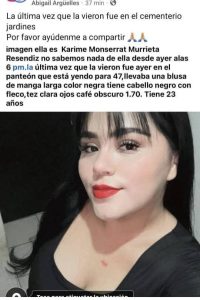Mientras familiares de Karime Monserrat Murrieta Reséndiz, también de 23 años, detallaron que la joven portaba blusa de manga larga negra, tiene cabello negro, tez clara y mide 1.70 metros.