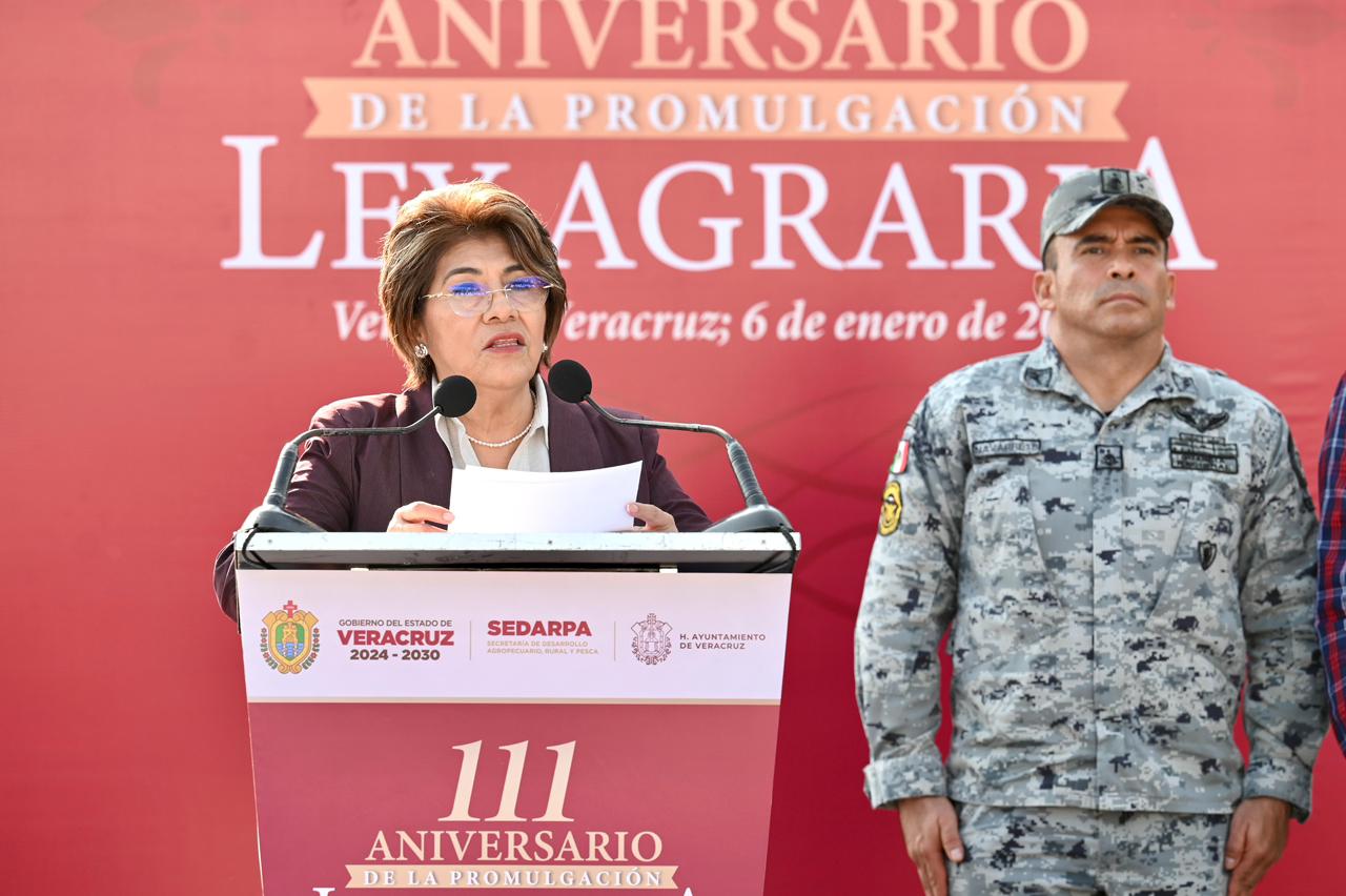 Veracruz, Ver., 06 de enero de 2026.- La alcaldesa de Veracruz, Rosa María Hernández Espejo, acompañó a la gobernadora del estado, Rocío Nahle García, en la conmemoración del 111 aniversario de la promulgación de la Ley Agraria, acto en el que se refrendó el compromiso de los tres órdenes de gobierno con el fortalecimiento del campo y la justicia social, como una tarea vigente y prioritaria para el desarrollo nacional.