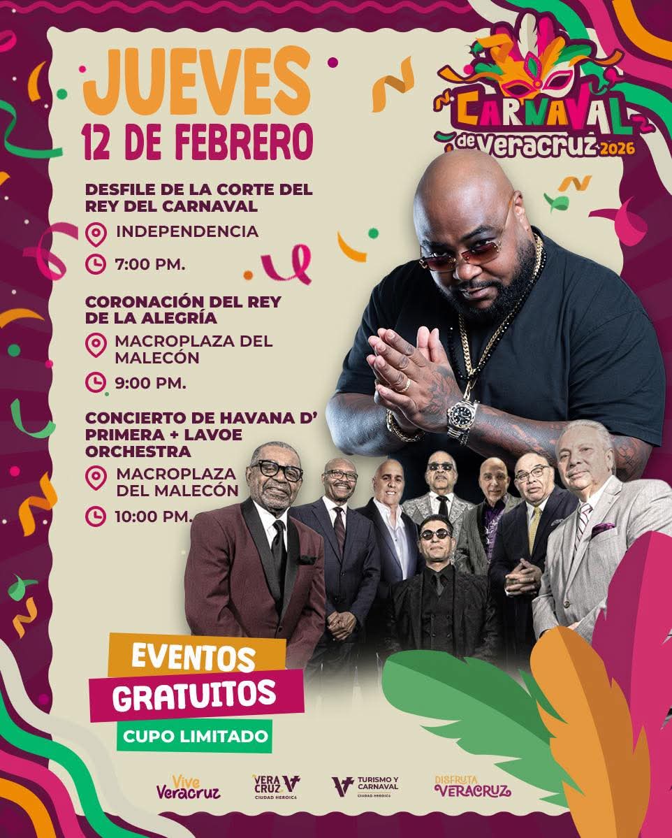 Los eventos son gratuitos y con cupo limitado, por lo que se recomienda asistir con anticipación para disfrutar de esta noche en la que Veracruz se viste de gala para celebrar a su Rey de la Alegría.