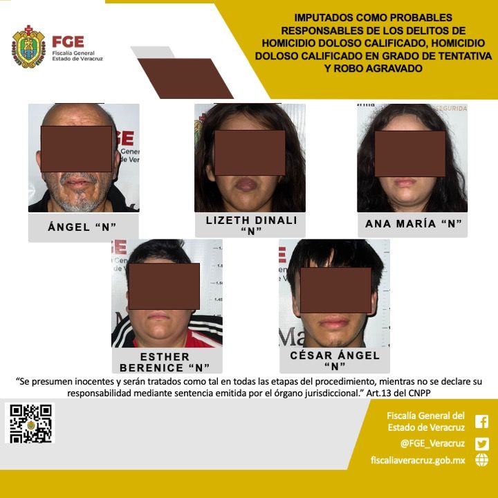 A través de la Fiscalía Regional Xalapa, se formuló imputación en contra de Ángel “N”, Lizeth Dinali “N”, Ana María “N”, Esther Berenice “N” y César Ángel “N”, como probables responsables de los delitos de homicidio doloso calificado, cometido en agravio de la víctima J.A.M.G., y homicidio doloso calificado en grado de tentativa y robo agravado, en agravio de O.C.J. quienes se desempeñaban siendo ambos empleados de la Comisión Estatal para la Atención y Protección de Periodistas (CEAPP); Los hechos ocurrieron el 25 de junio del año en curso, al interior de un establecimiento donde presuntamente se le suministró a las víctimas, J.A.M.G., y O.C.J. un Fármaco en sus bebidas para posteriormente despojarlos de sus pertenencias.