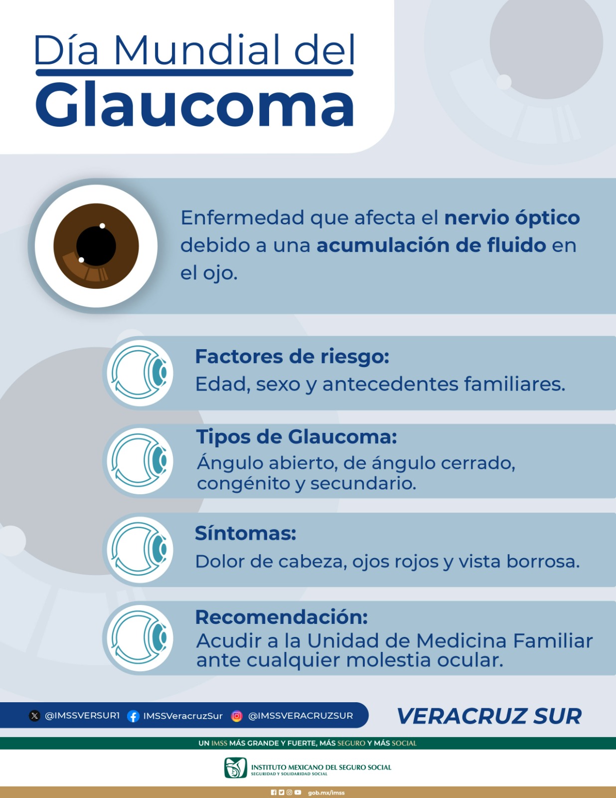 Orizaba, Ver., 11 de marzo de 2024.- En el marco del Día Mundial del Glaucoma /12 de marzo), el Instituto Mexicano del Seguro Social (IMSS) en Veracruz Sur, exhorta a la población a conocer los síntomas de este padecimiento, el cual afecta principalmente a personas mayores de 40 años y de no atenderse puede causar ceguera.