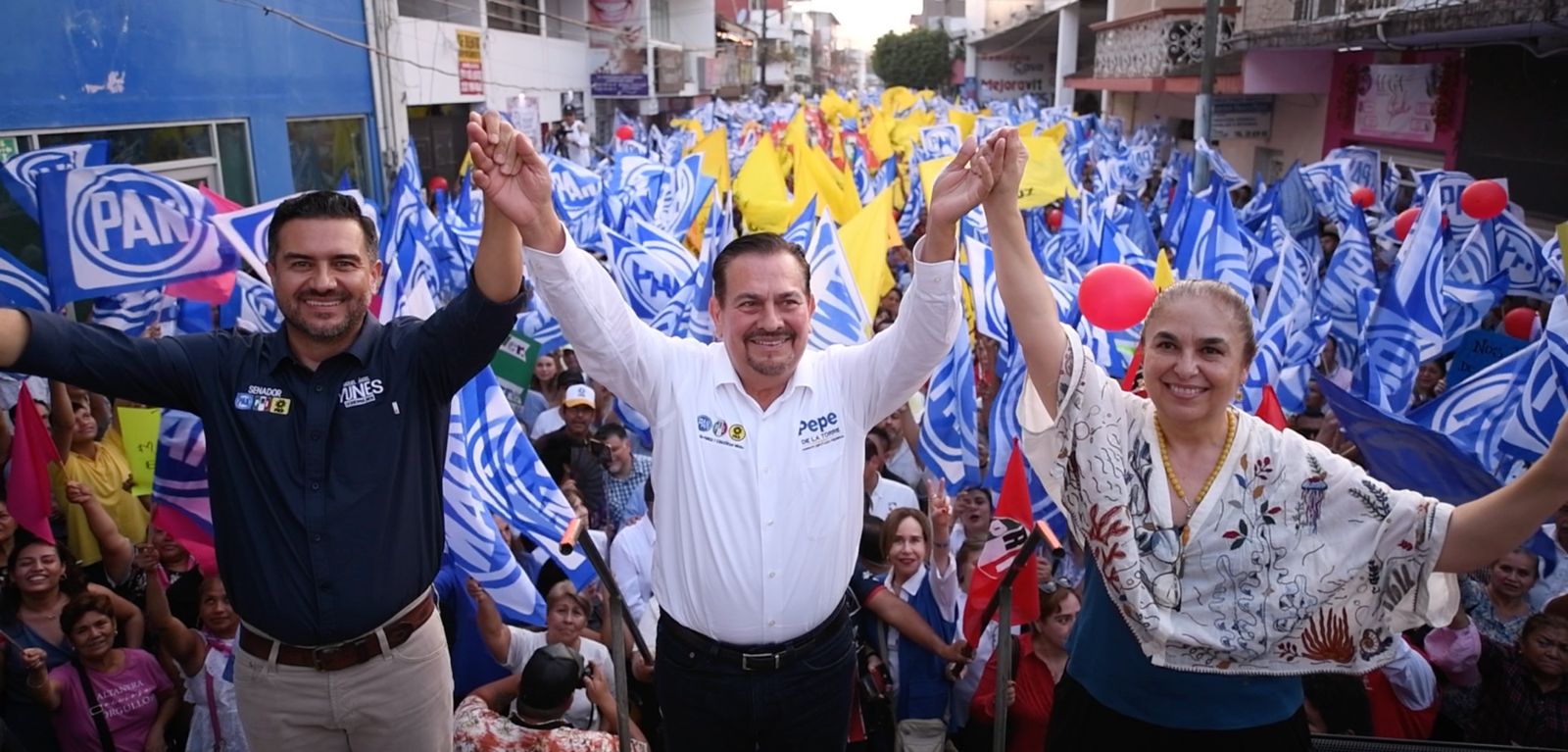 En el evento, estuvo acompañado por Sara Ladrón de Guevara, candidata al senado por el PRD y por Pepe de la Torre, candidato a diputado federal por el distrito de Martínez de la Torre.