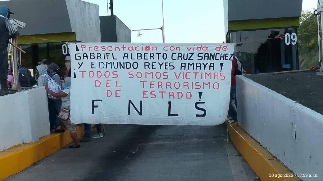 Veracruz.- Un grupo de personas cubiertas del rostro, que se autodenomina Frente Nacional de Lucha por el Socialismo (FNLS), tomó la caseta de cobro Tuxpan-México y exigió la aparición con vida de más de 350 mil personas en el país.