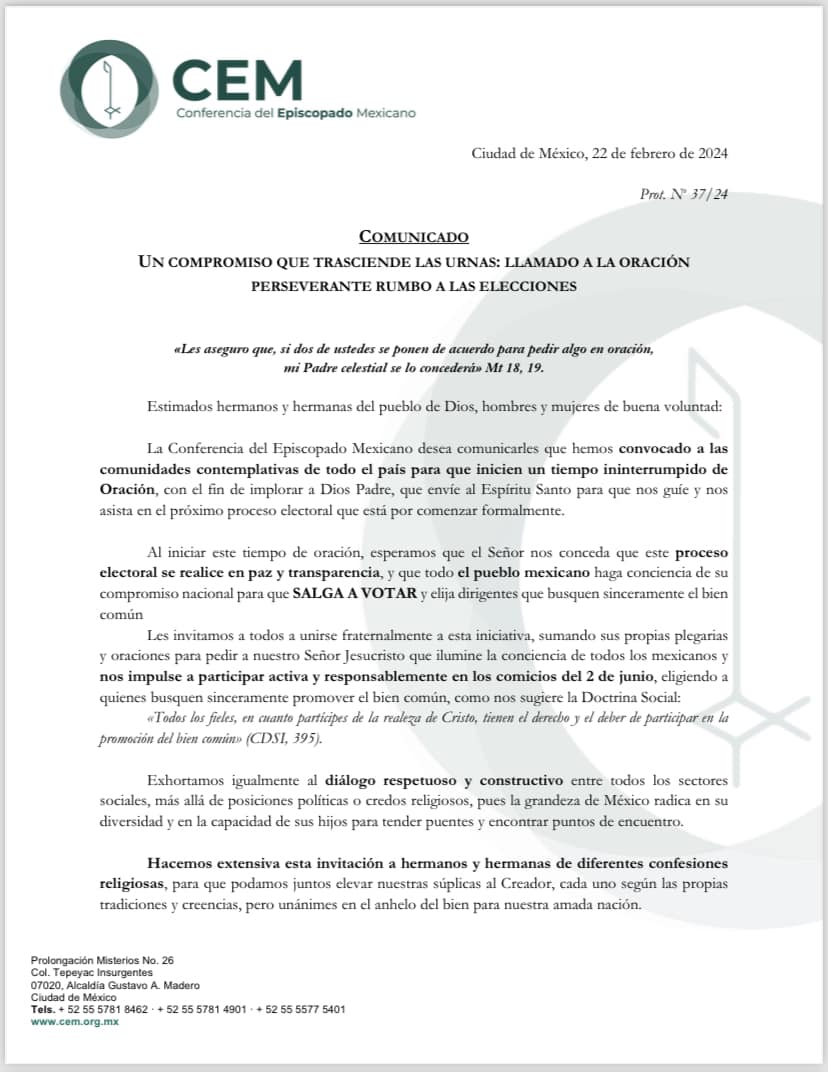 A través de un comunicado, la Conferencia del Episcopado Mexicano hace una invitación a unirse a una cadena de oración “sumando sus propias plegarias y oraciones para pedir a Jesucristo que ilumine la conciencia de todos los mexicanos y nos impulse a participar activa y responsablemente en los comicios del 2 de junio, eligiendo a quienes busquen sinceramente promover el bien común”.