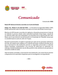 Xalapa, Ver., Martes 21 de abril del 2026.– La Secretaría de Seguridad Pública (SSP) brinda información sobre los hechos ocurridos en el norte del Estado el día de ayer.