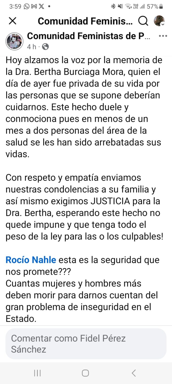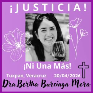 Desde su cuenta de Facebook, la llamada Comunidad Feminista de Poza Rica lanzó: «Hoy alzamos la voz por la memoria de la Dra. Bertha Burciaga Mora, quien el día de ayer fue privada de su vida por las personas que se supone deberían cuidarnos.