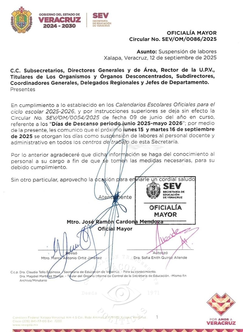 En la circular, la Oficialía Mayor instruye a todas las áreas de la SEV a suspender actividades, contradiciendo la comunicación previa (SEV/OM/0054/2025), que había indicado que el lunes 15 de septiembre se realizarían labores normales para garantizar la continuidad del servicio educativo, en atención al interés superior de niñas, niños y adolescentes.