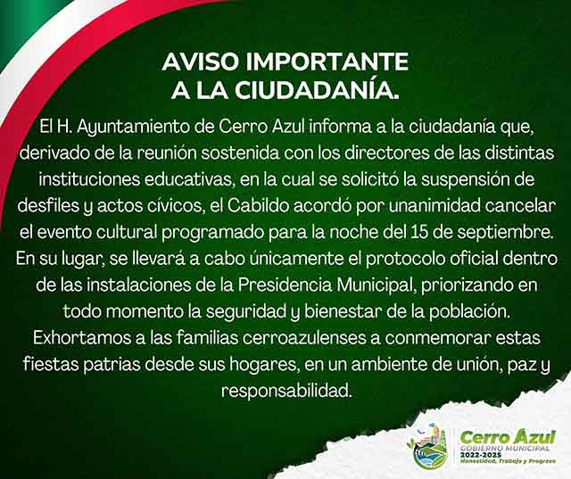 En un documento, publicado desde sus redes sociales, el ayuntamiento de Cerro Azul argumentó que la cancelación de los eventos por las fiestas patrias se acordó por unanimidad.